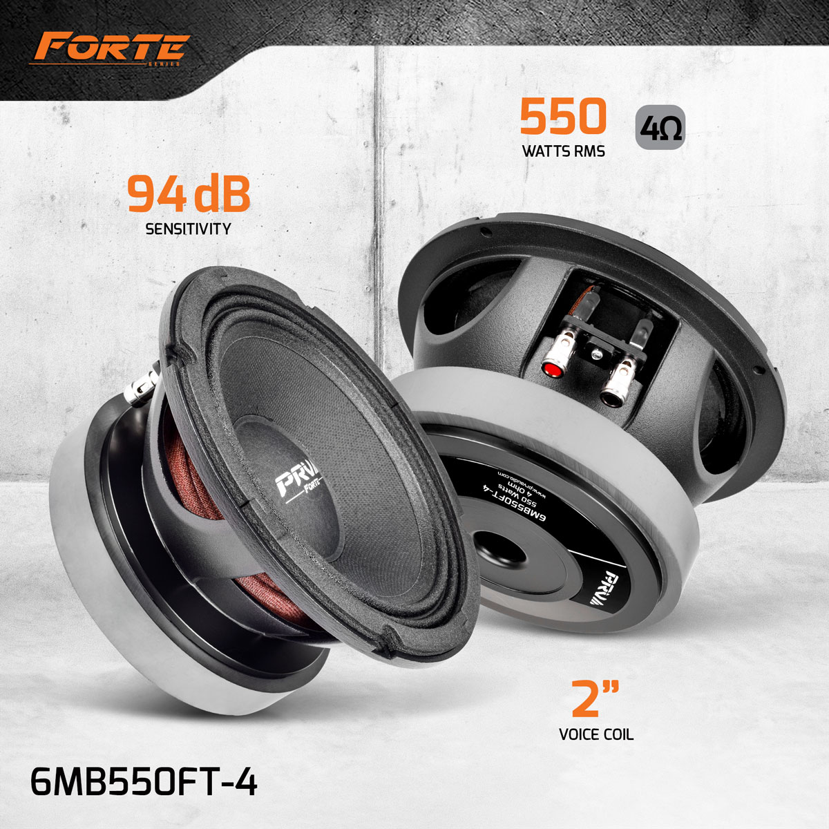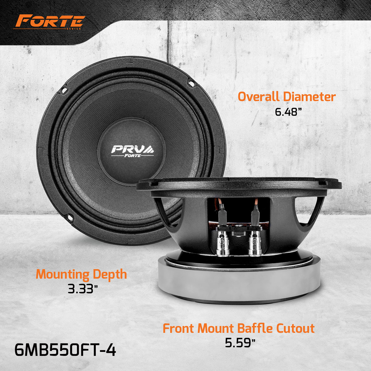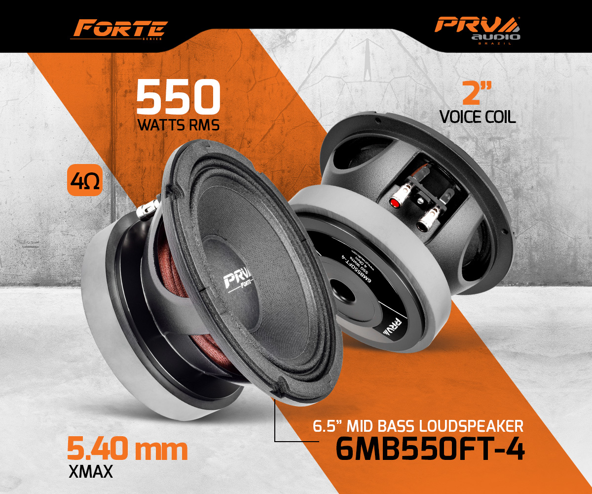 PRV Audio’s 6MB550FT-4 6.5″ Forte Series midbass was specially tailored to give you more Xmax and less distortion on mid low midbass frequencies, with its Peak-to-Peak excursion going up to 14 mm (0.55″) this speaker can give a heck of a punch!