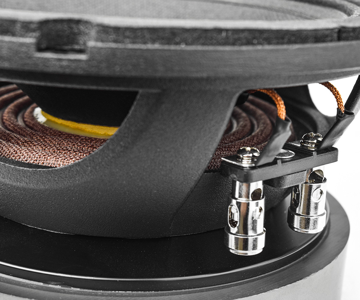 The tall 2″ voice coil ensures high heat dissipation and the necessary motor strength to deliver high sensitivity even on high power with the minimum distortion with recommended High Pass filter of 90Hz at 18 dB Octave.